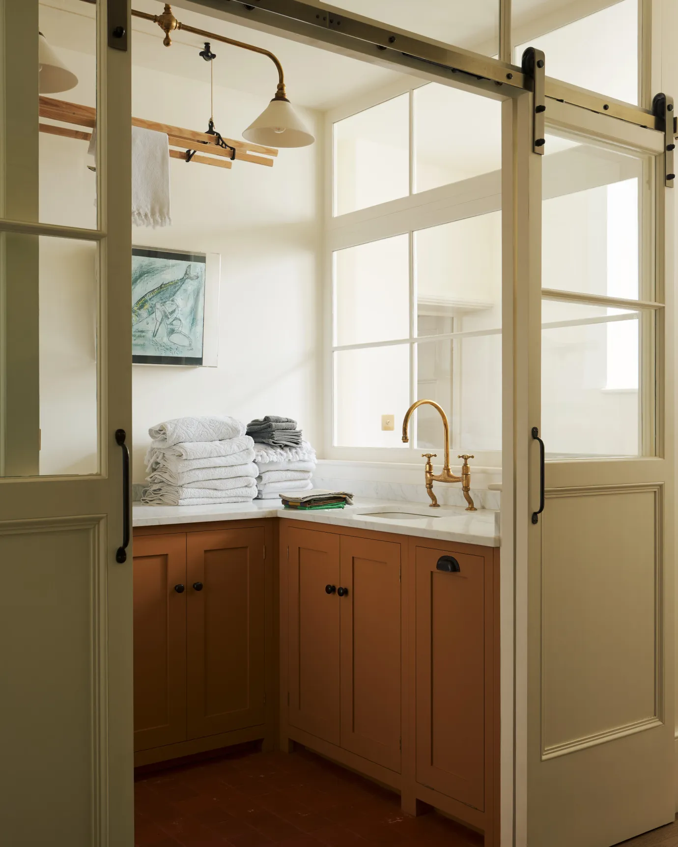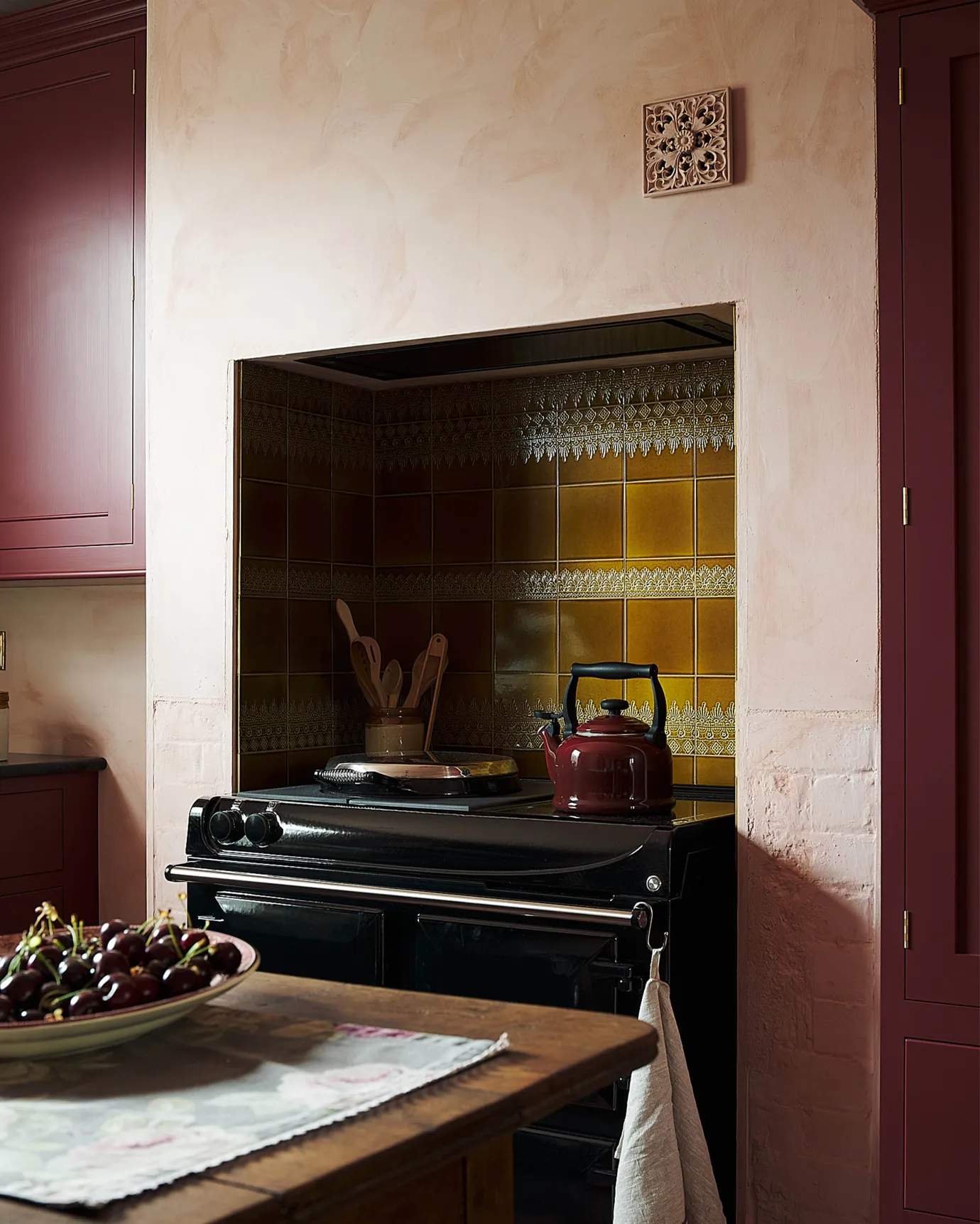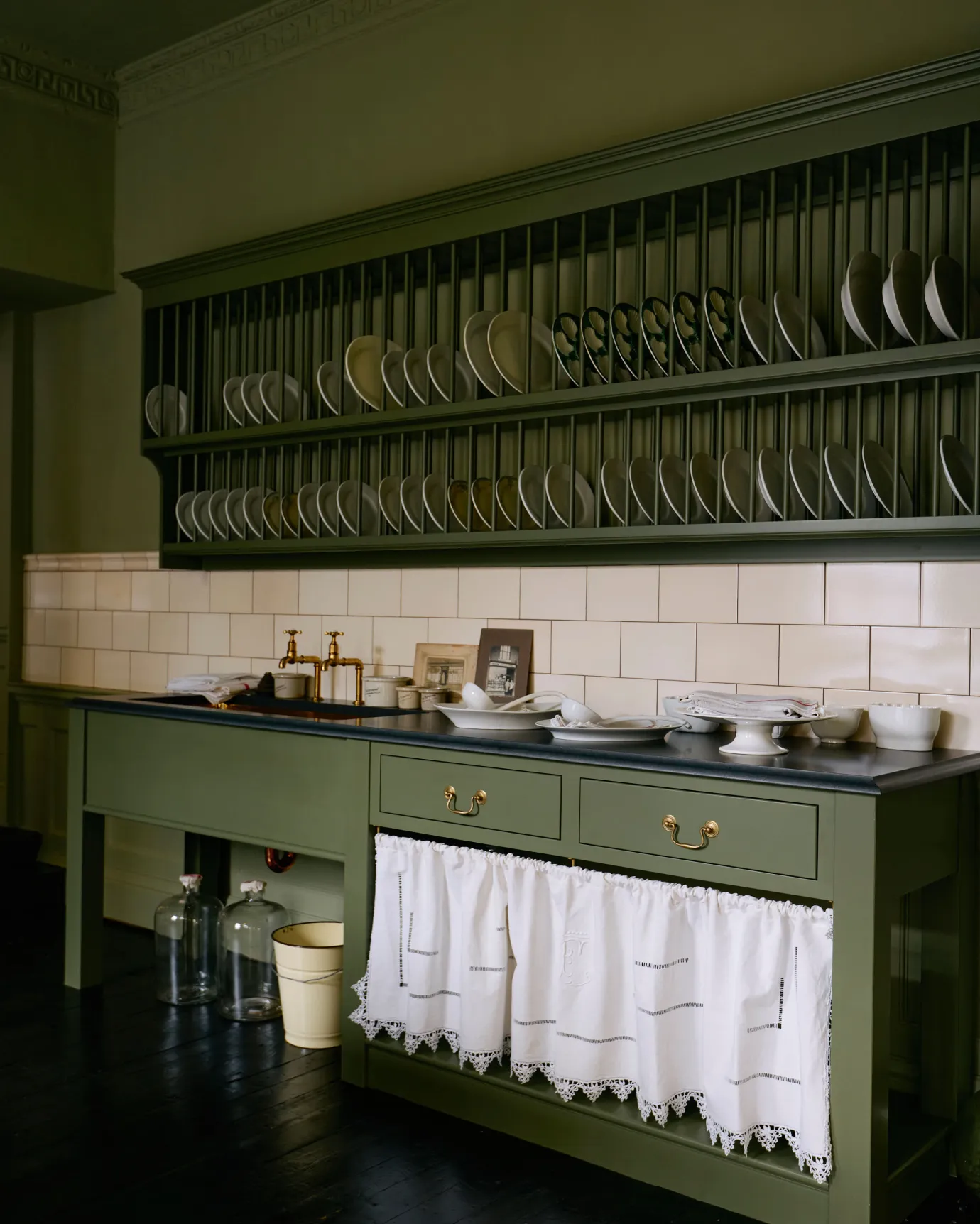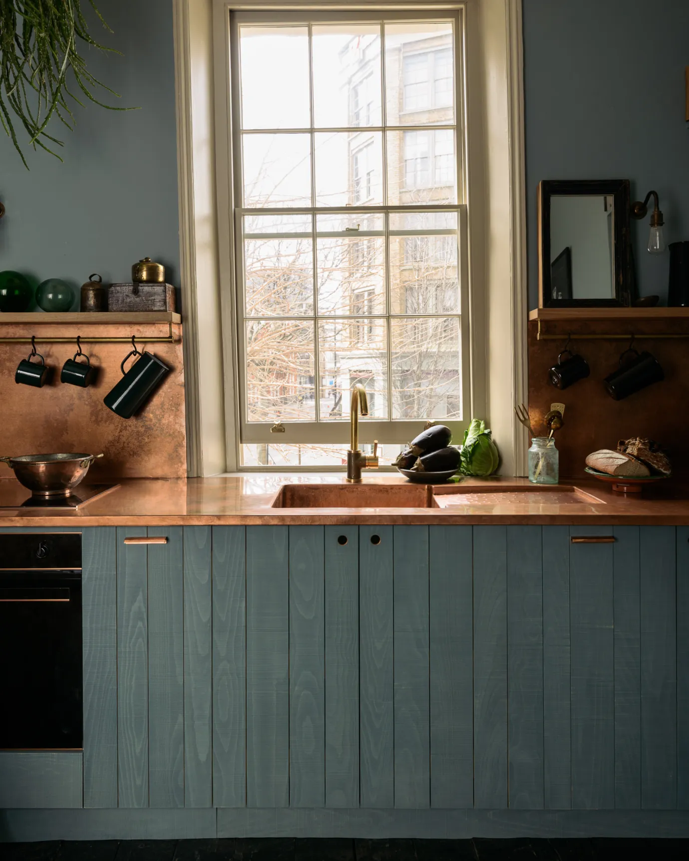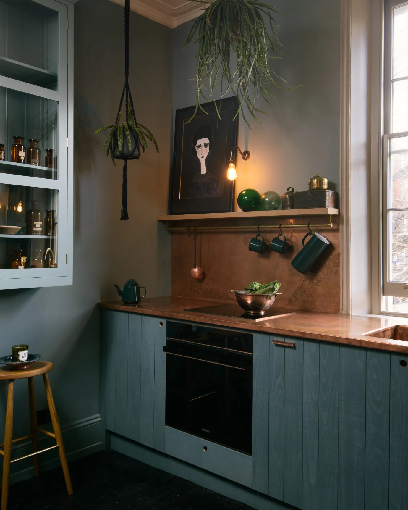 The Haberdasher's Kitchen features unpainted oak cupboards inspired by mid-century English furniture.