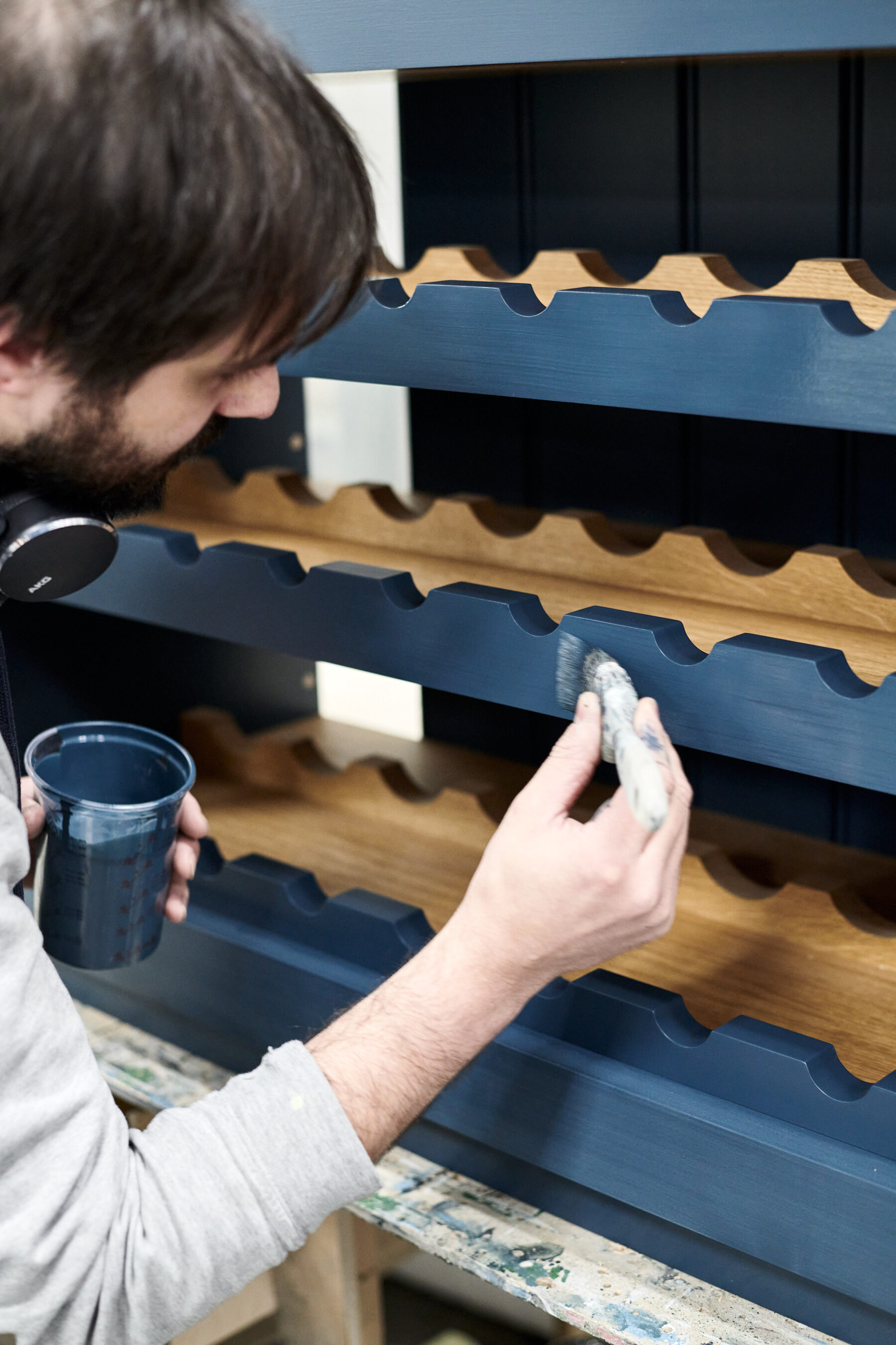 We paint the interiors and exteriors of our cabinets using a water-based acrylic paint for both collections of furniture. The first two coats are spray painted and we then finish with a hand-painted coat. Our process of brush painting not only creates a subtle traditional appearance but enables our furniture to be quickly and easily touched up in the event of the inevitable knocks and scrapes that happen over time. In many respects, we are quite old fashioned with our approach to furniture, but sticking to traditional principles ensures a product that ages gracefully and is a pleasure to live with.