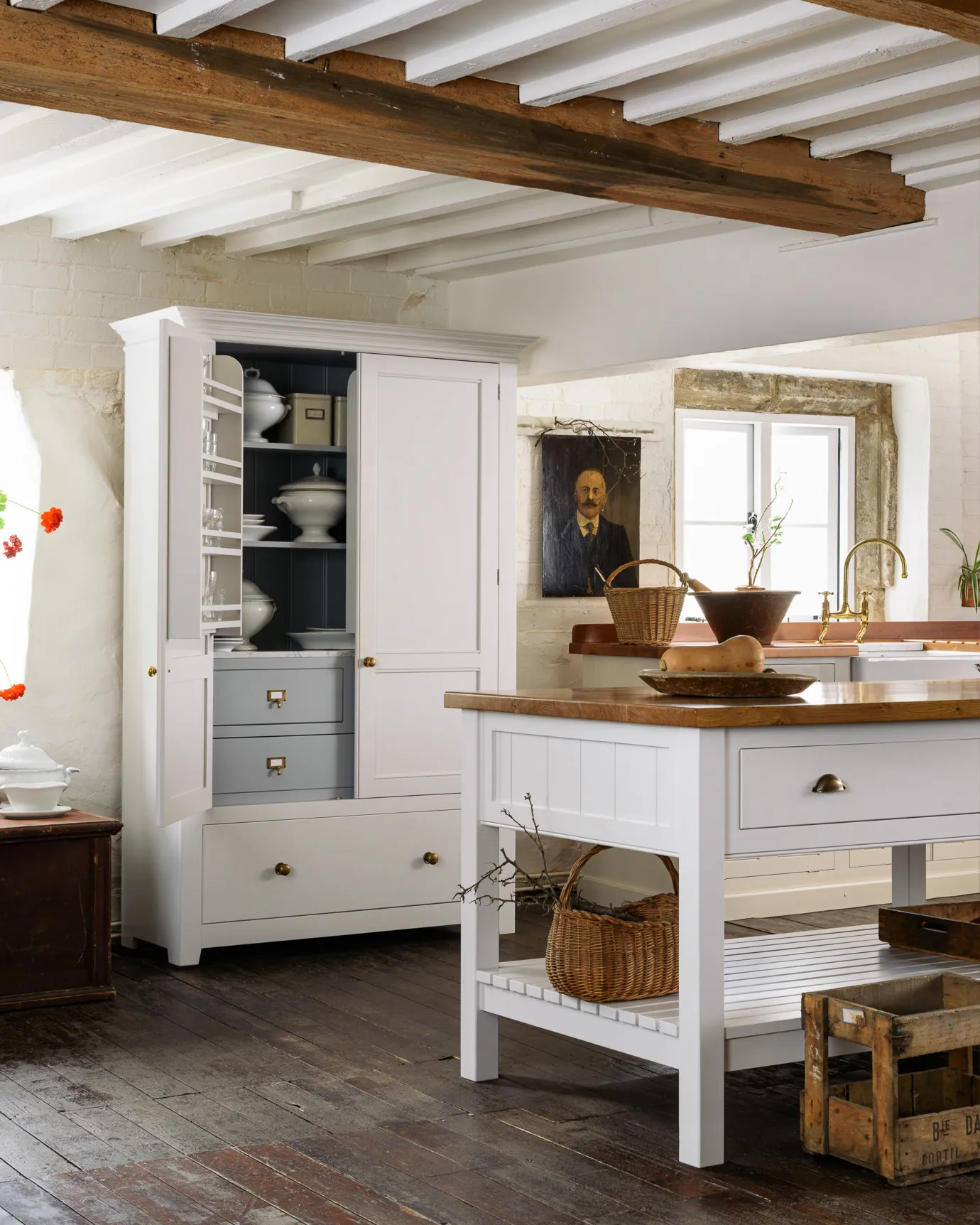 Bakehouse Green was the colour choice here for the painted Classic English furniture and plenty of storage was the goal. No open shelves or glass, it was all behind doors and drawers but everything still to hand, just keeping the room clutter-free. The only opportunity to display was one simple aged brass rail above the range cooker, adorned with a classic collection of copper pots, the restraint was so good.