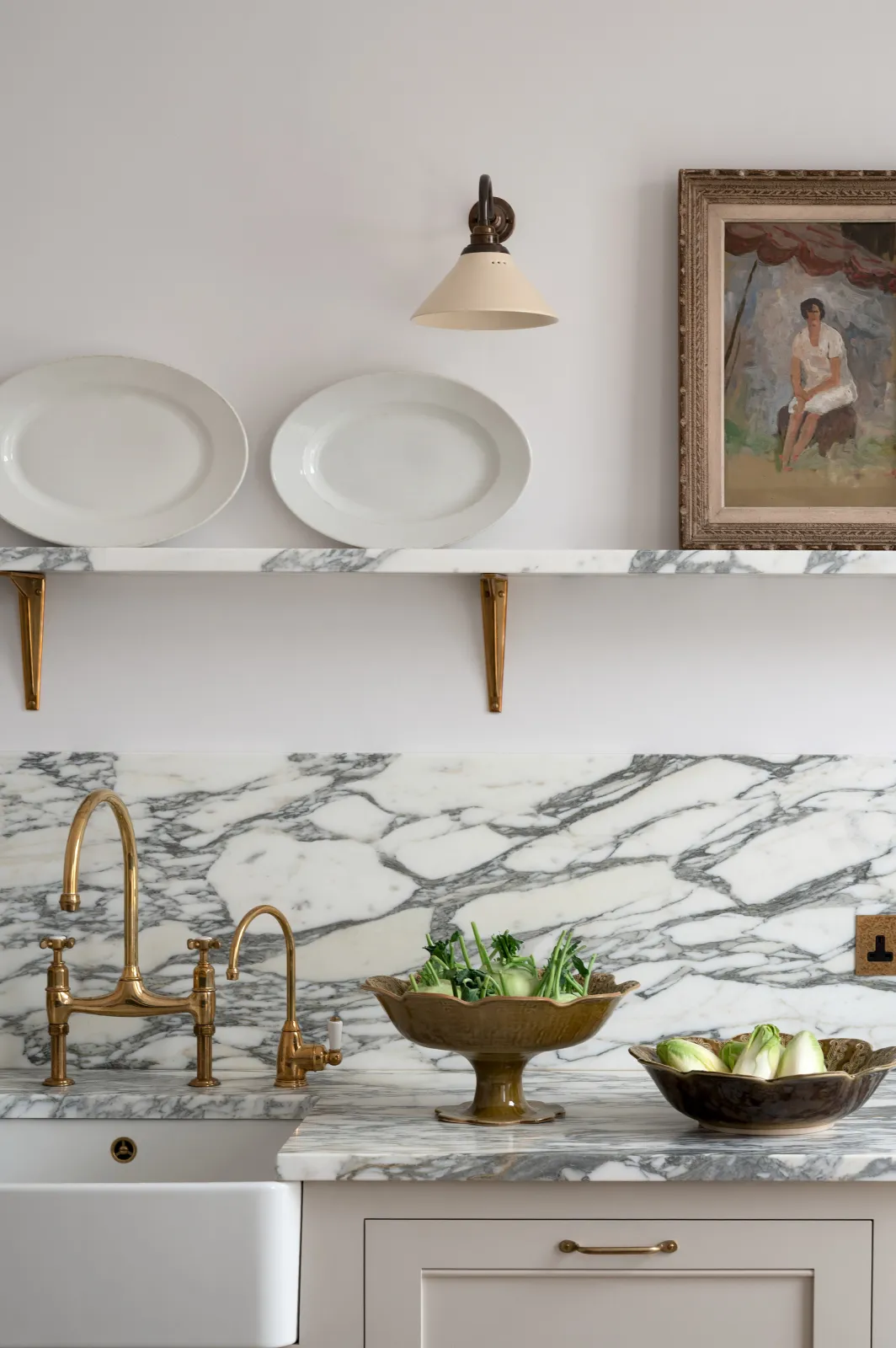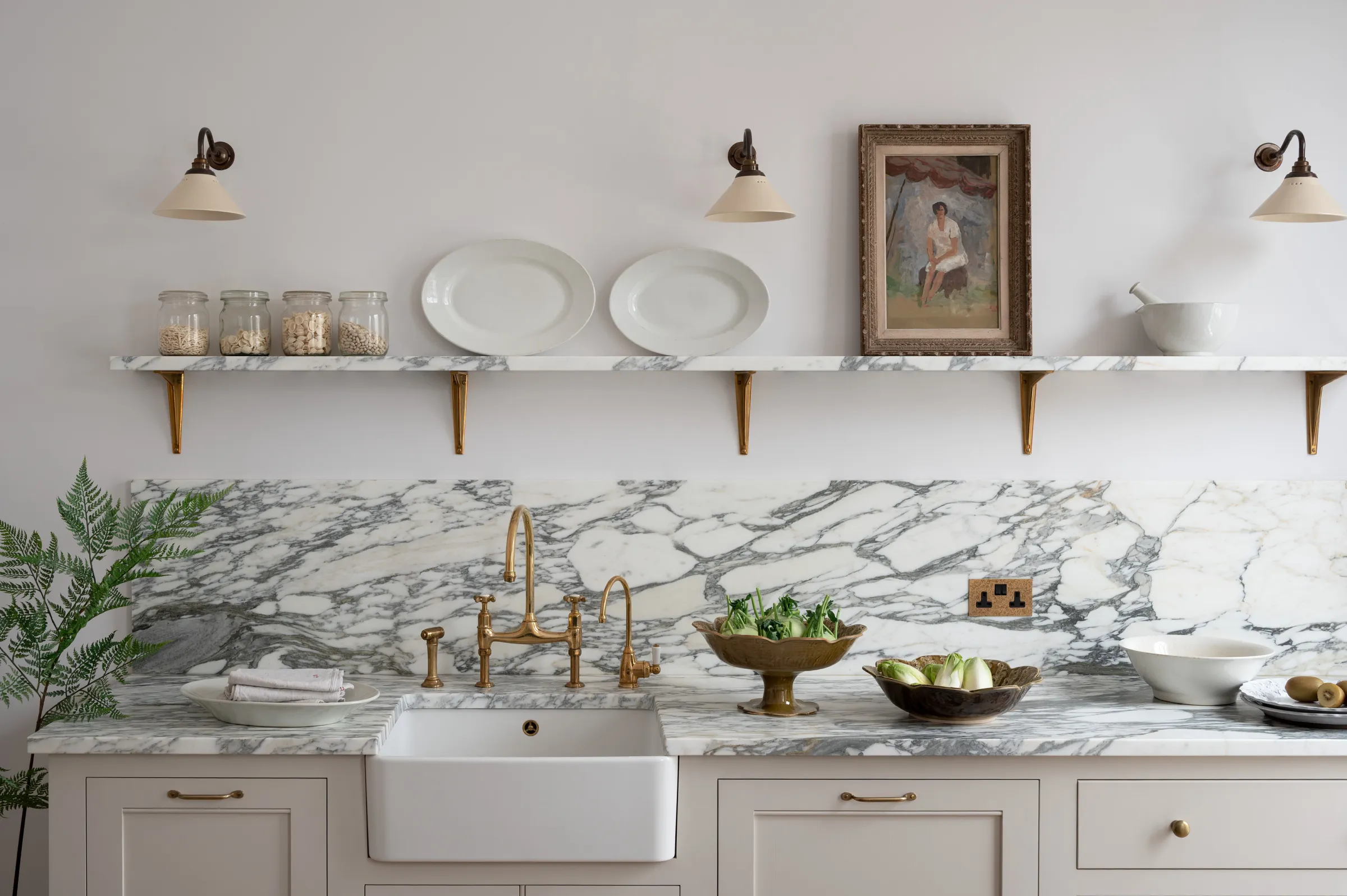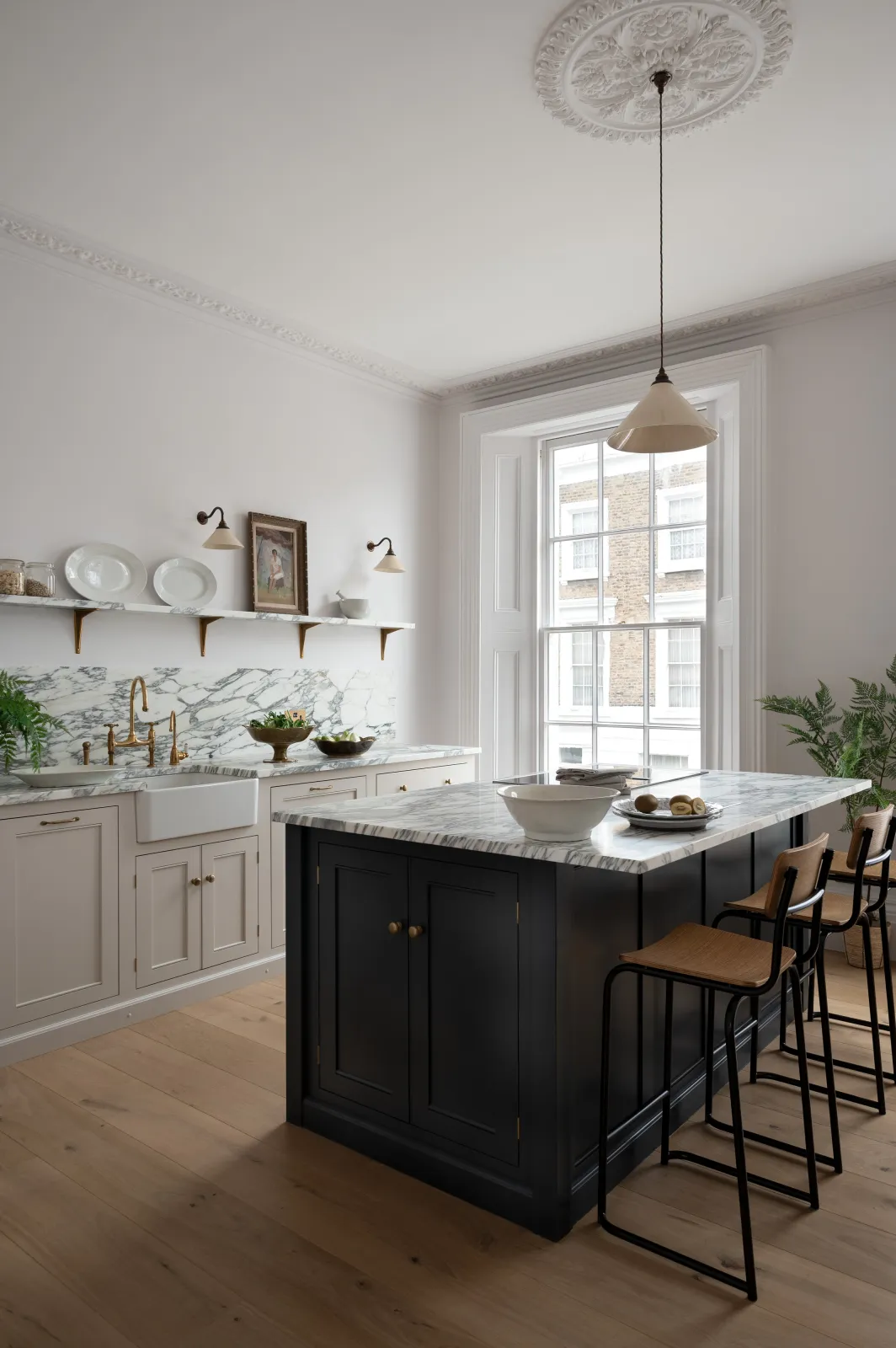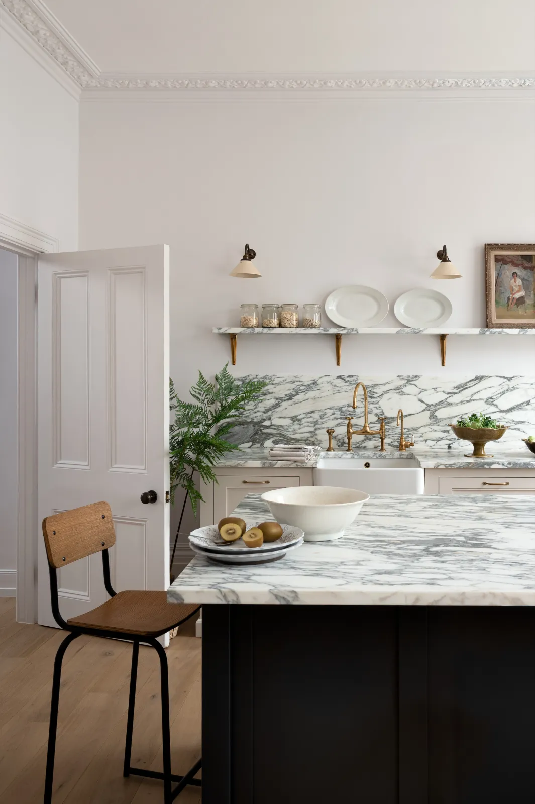 A custom stony off-white paint for the perimeter furniture and our famous Pantry Blue for the island was a cool combination, in fact, it reminded us a little of the old deVOL days. Some things just never go out of style, do they? Honed Arabescato marble topped the cupboards and even ran up the wall to create a pretty fabulous splashback and shelf. Aged brass hardware added warmth, our creamware lights sat quietly and we especially loved the unexpected inclusion of a few Plumber's Stools, they worked so well here, adding a teeny bit of industrial edge.