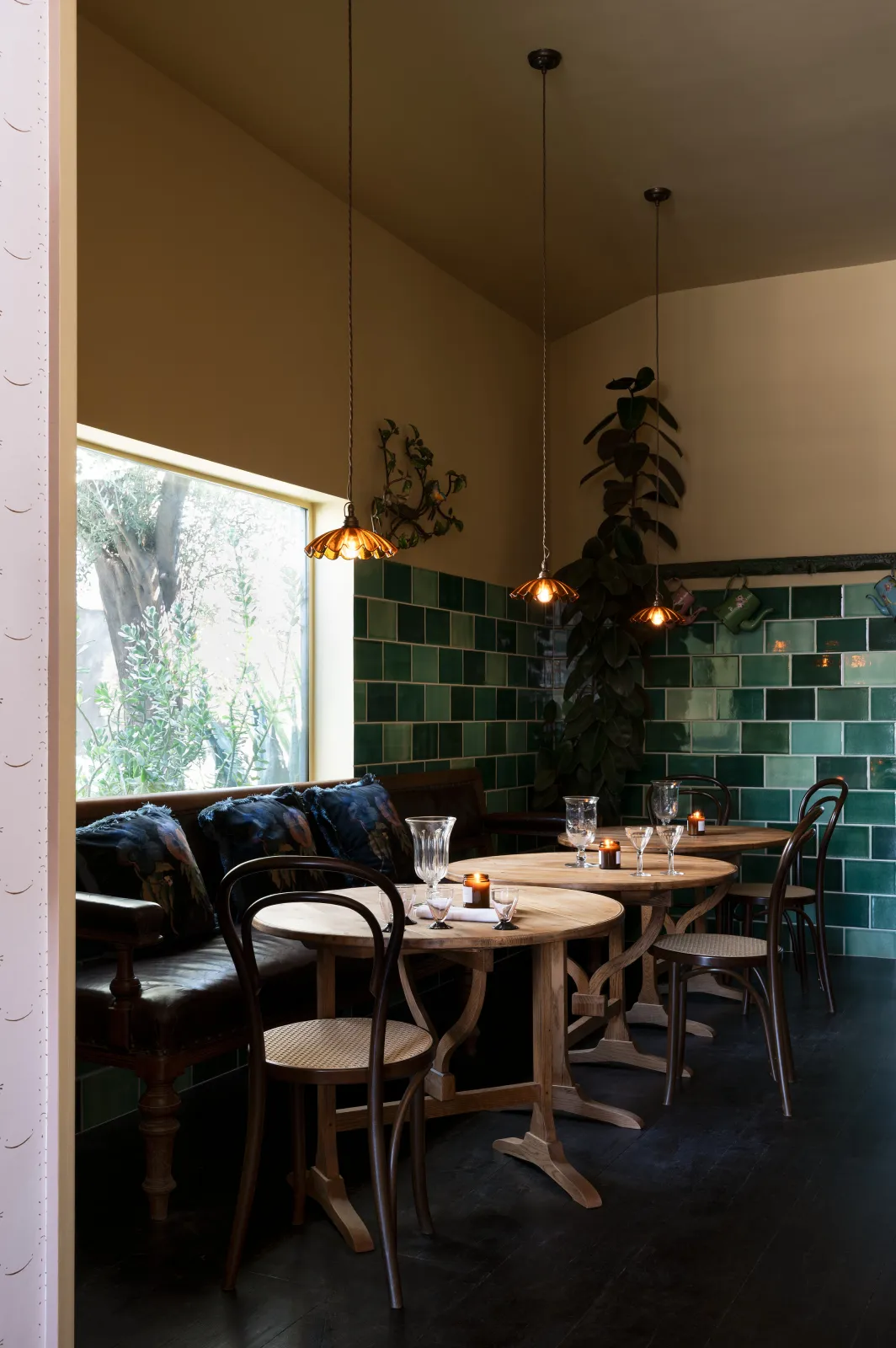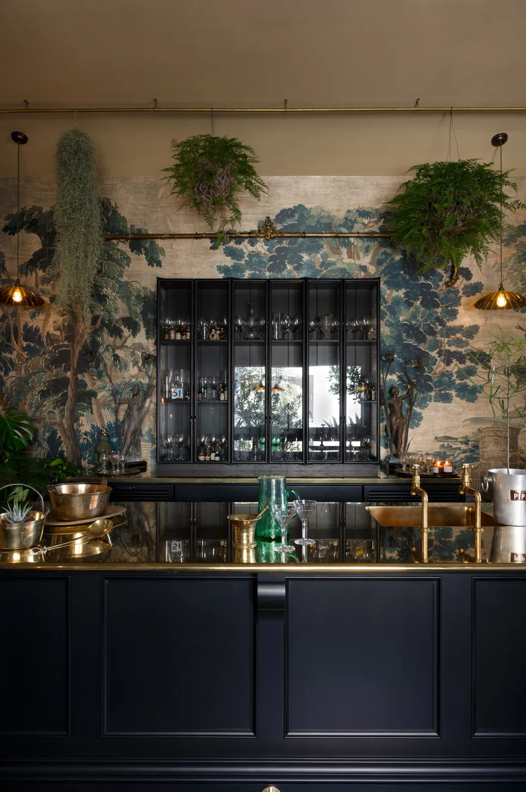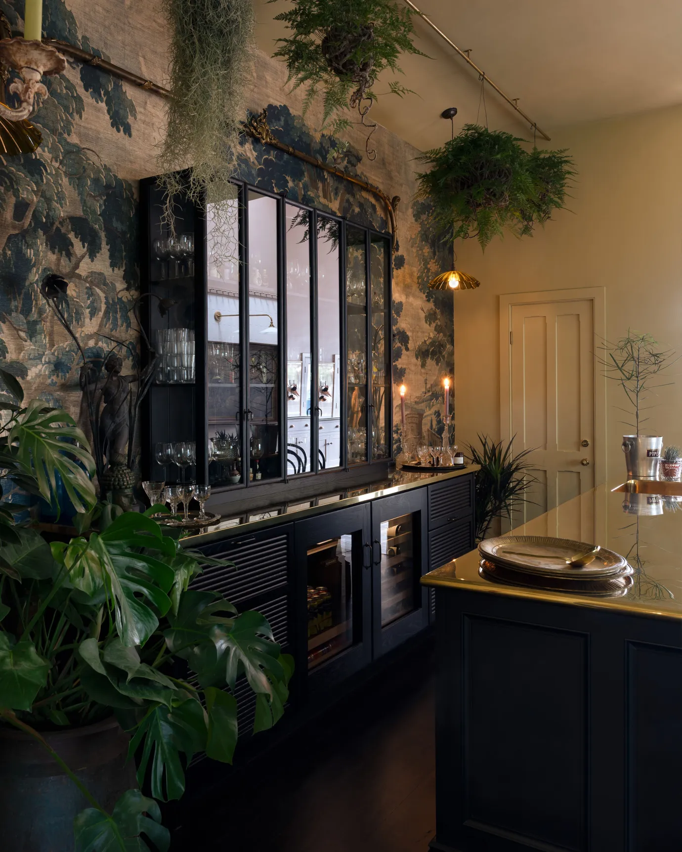 The tall, glazed wall cupboards and tambour base cabinets incorporate not only masses of glassware storage, but a wine fridge, a drinks cooler and recycling bins, making this area totally set up for an impromptu party or a quick nightcap before bed. Inspired by the legendary Le Coucou bar in New York, we added our Emerald Green London Tiles, Vineyard Tables and renovated an old English railway bench (bought from eBay) to complete this intimate and atmospheric room. We filled the ceilings and floor with ferns and greenery and our Frilly Chartreuse Lights, a few deVOL candles and the mood was set. We finished it all off with a curated collection of vintage bar accoutrements that we have collected over many trips to flea markets and antique fairs back home in England.