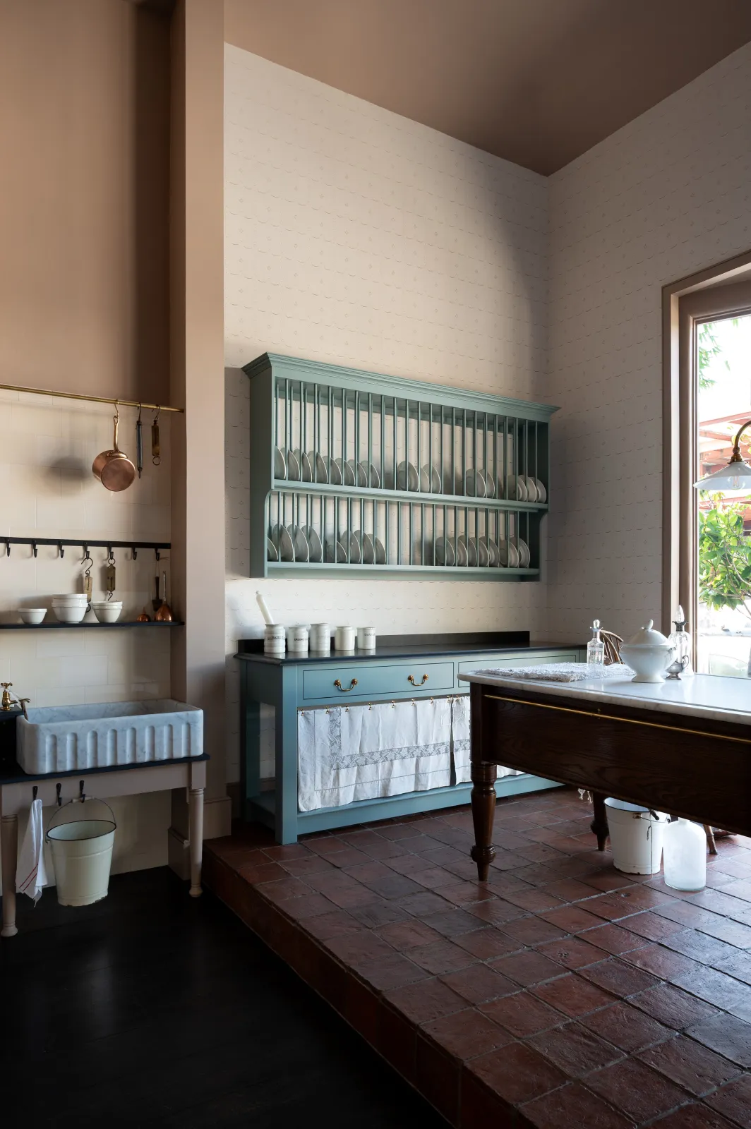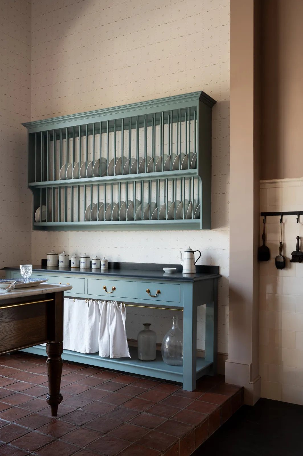 This very simple display shows a space that is quintessentially English, with its terracotta tiled floor, Dairy Table, open cupboards and delightfully organised plate racks. The walls have been covered in our Ditsy Delft Wallpaper, subtle and clean and the perfect ‘hardly there’ backdrop to the Trinity Blue cupboards and simple styling.