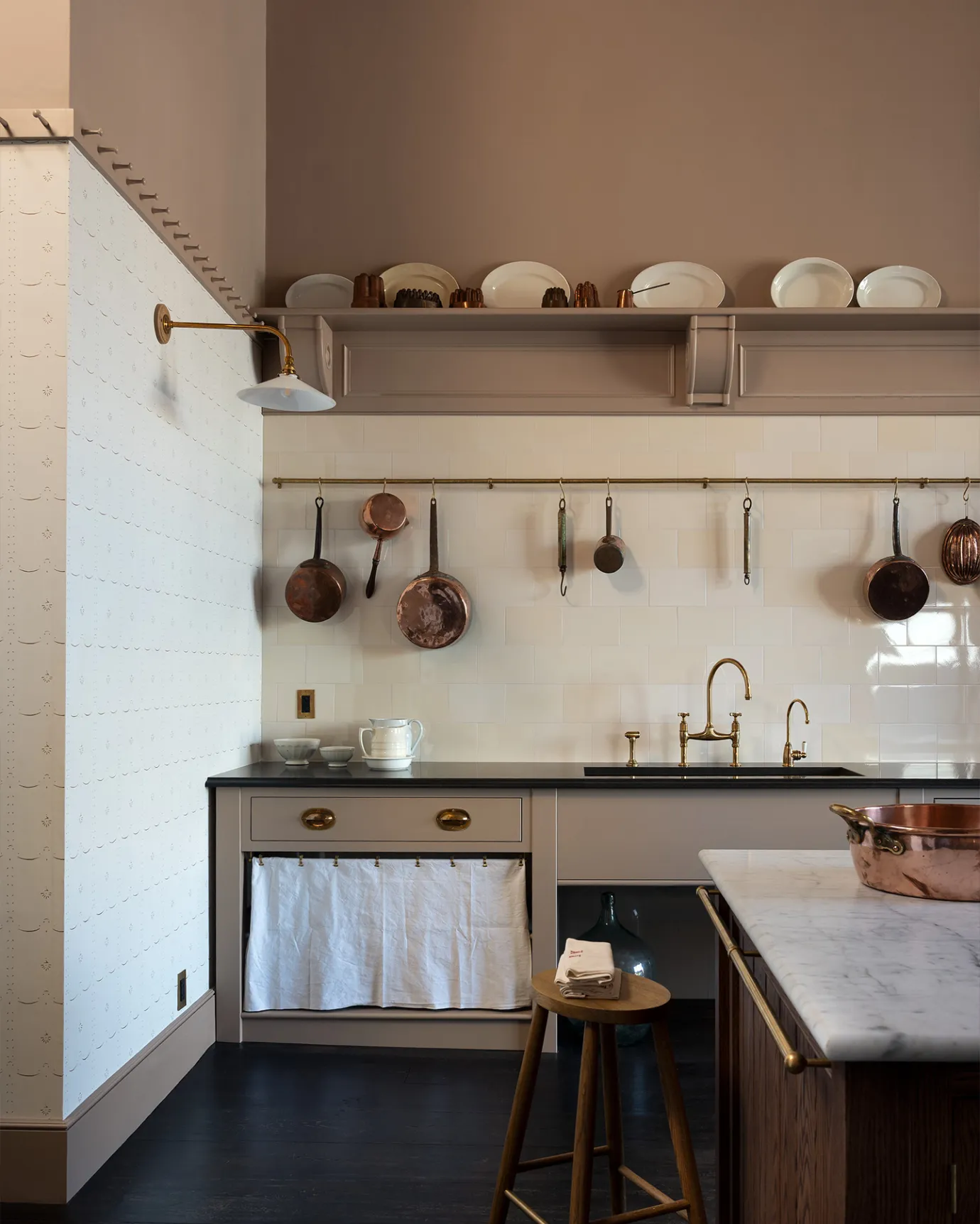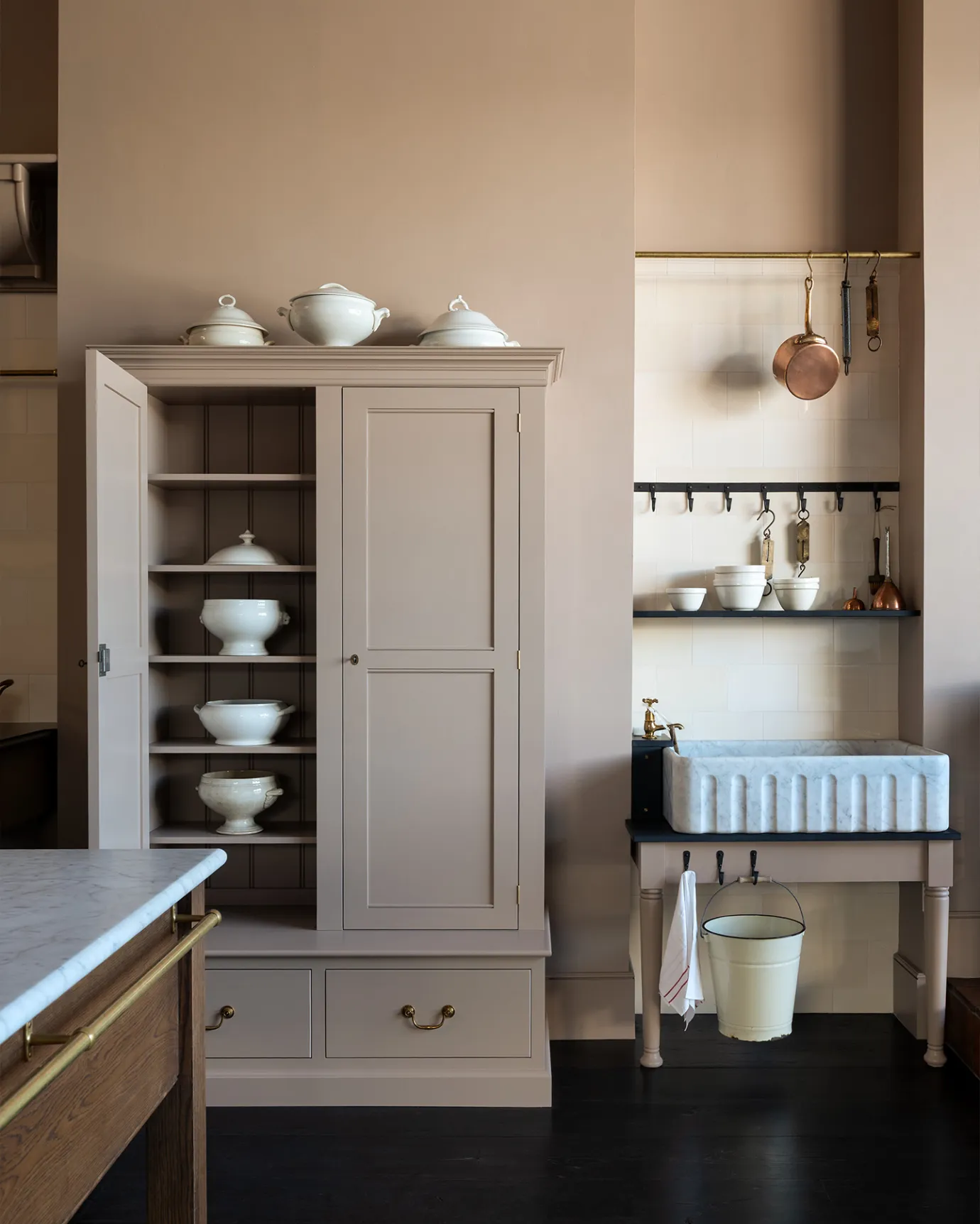 A prep table that has been inspired by the ‘under the stairs’ kitchens at Lanhydrock House in Cornwall. This National Trust property is one of our favourites because the kitchens are all so inspiring and relevant today. It’s hard to better the whole concept of these kitchens, their austere beauty and their supreme functionality and most importantly, their ability to feel totally current.
