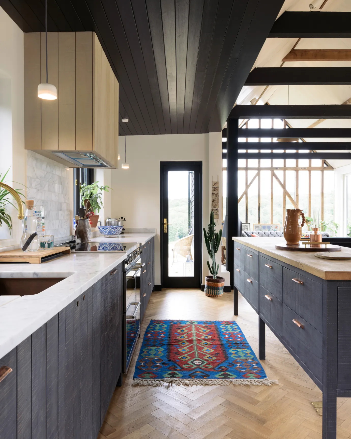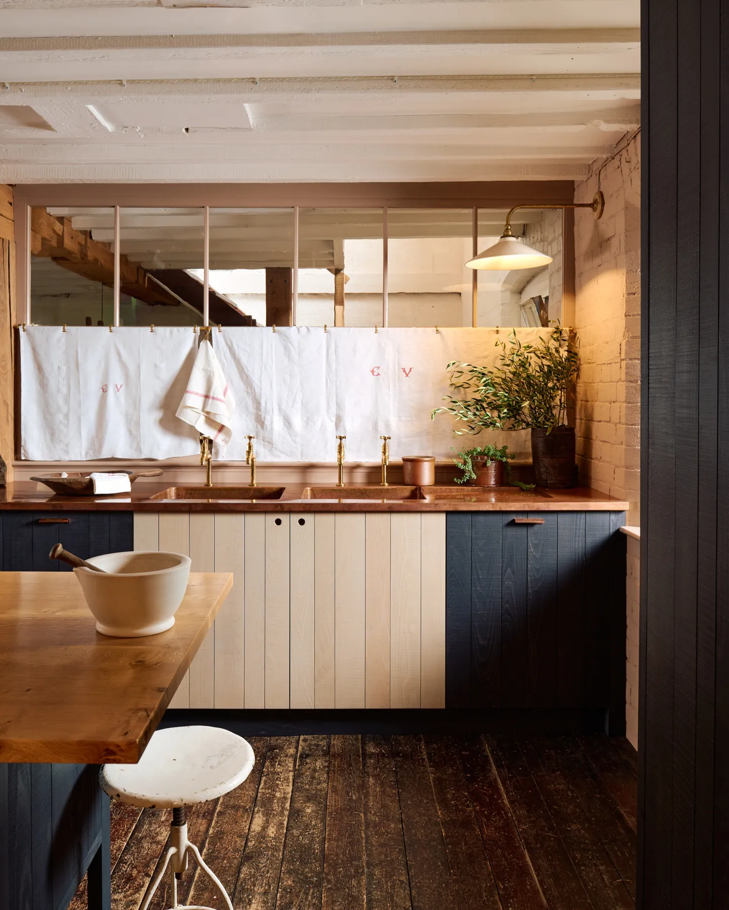 Setting Plaster paint by Farrow and Ball, almost not a colour, the merest hint of salmon pink on the walls and woodwork was the starting point for this room. We stripped the walls of plaster and found a beautiful brick that was exactly right for both a potting shed and the Sebastian Cox cupboards, so we cleaned it up and left it alone. Obstacles aside, we were finally able to open bricked up windows and doors and let the light back into this room, it now feels calm and light. We chose handmade terracotta tiles from our sister company, Floors of Stone, they have a way of making any room suddenly feel better than it did before, they are a beautifully rustic flooring that is also incredibly hard-wearing.