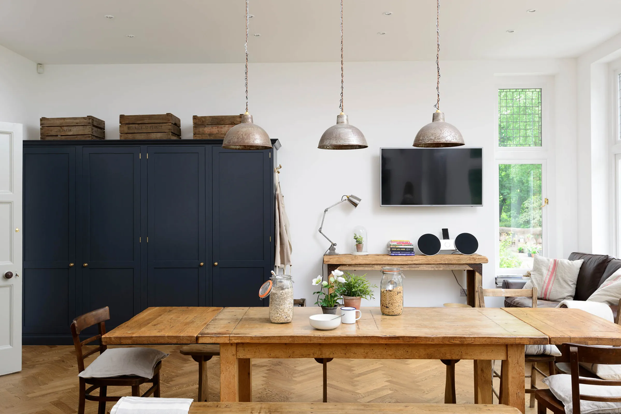 The styling in this room was centred around a beautifully renovated parquet floor; the warm colour of the woods on the floor, table and island all gave a lovely tactile feel to this kitchen. Hardwearing, light coloured Silestone worktops around the sink and cooker contrasted really well with the wood and gave the room a little touch of industrial to go with the selection of vintage lights hanging from the ceiling on chains which must have been close to 5 metres long. The ceilings were very high and, just to add to the atmosphere, there was an original minstrels' gallery at one end of the room that gave a magnificent view of this very special kitchen. The stylish combination of our Pantry Blue base cabinets, glazed London wall cupboards and island made up of standard Shaker cupboards meant that this kitchen was an instant hit, racking up more Instagram likes in 24 hours than any other deVOL Kitchen ever.