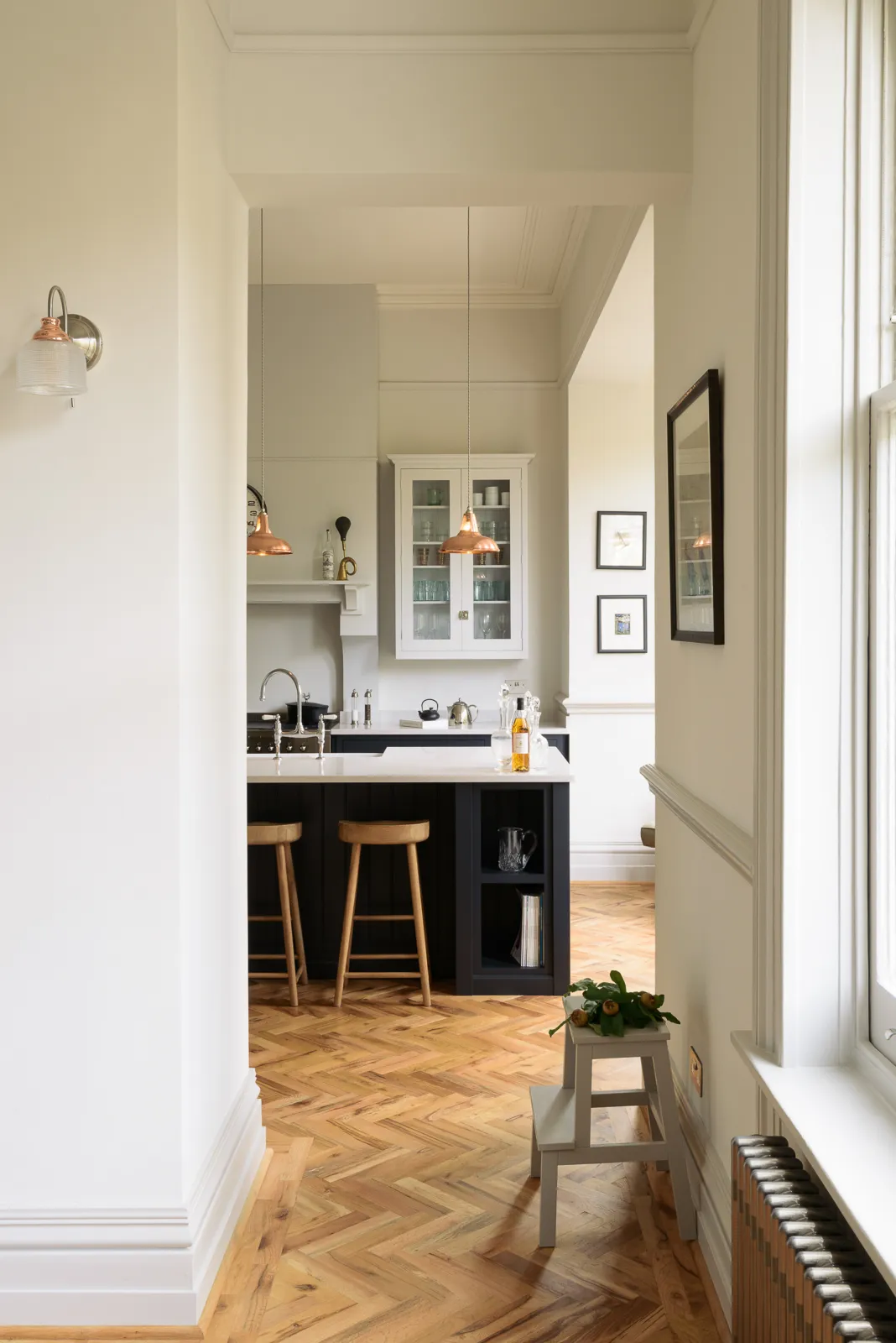 The Pantry Blue and Damask paintwork was cool and sophisticated, with pale Silestone worktops and parquet flooring from our sister company Floors of stone. This classic flooring ran throughout the downstairs and added a rich, warm feel to the house which worked really well with the sharp clean lines of the kitchen cupboards.