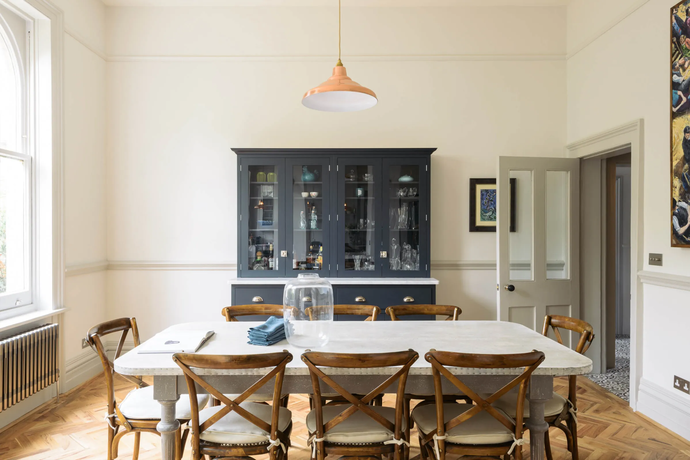 A ‘labour of love’ is how the owners of this house described their renovation of this incredible property, but when we saw it, it just looked like a beautifully grown-up house, all finished inside and out. The kitchen was at the front of the property, but the formally planted, walled garden kept the room very private and you felt a million miles away from Central London. That’s the perfect scenario really, grand property with rambling gardens to the front and back, hidden behind elegant walls yet so close to all that London has to offer. The kitchen began as two rooms but was cleverly changed into one, with central columns that allowed additional wine storage, work surface and a slight separation of spaces without feeling like separate rooms.